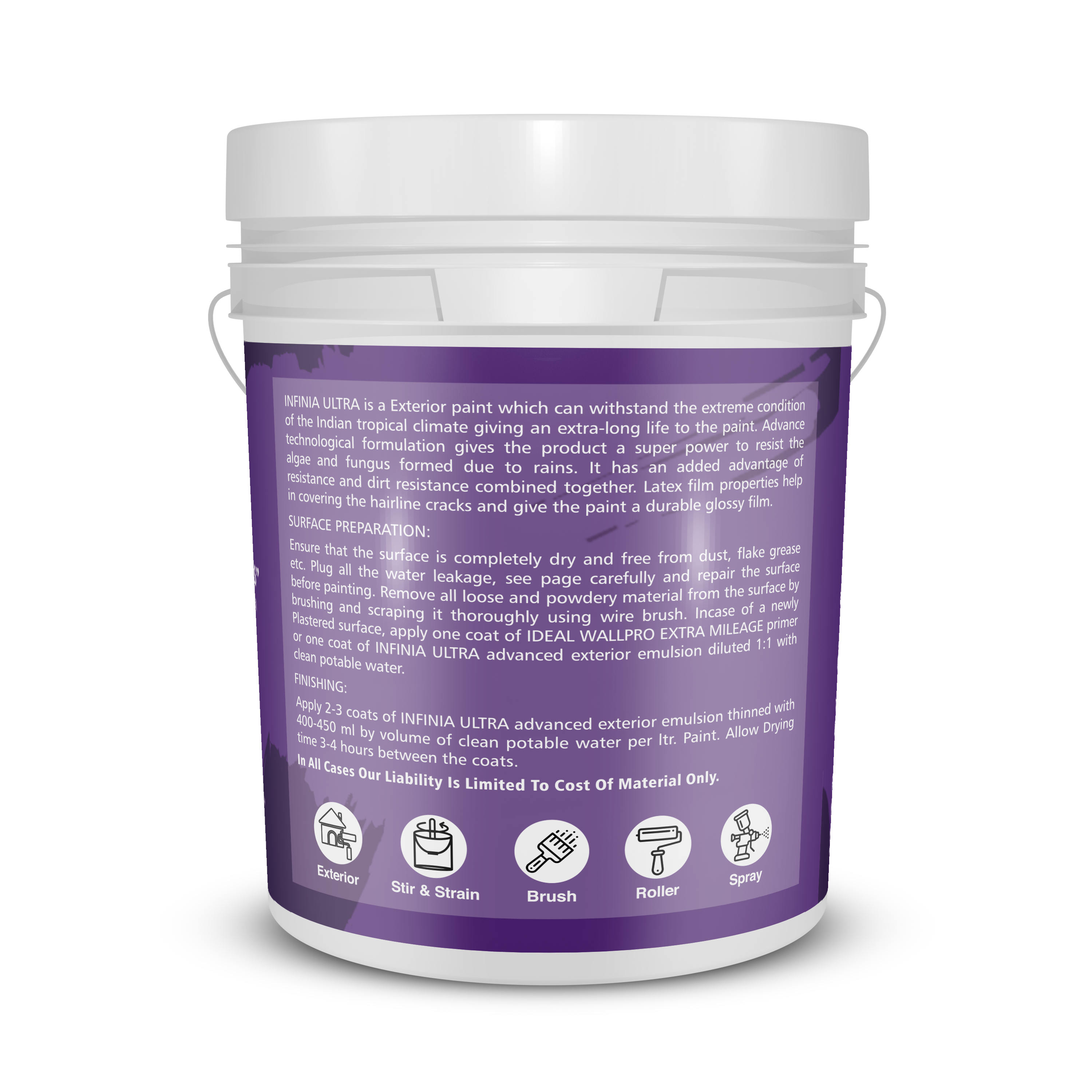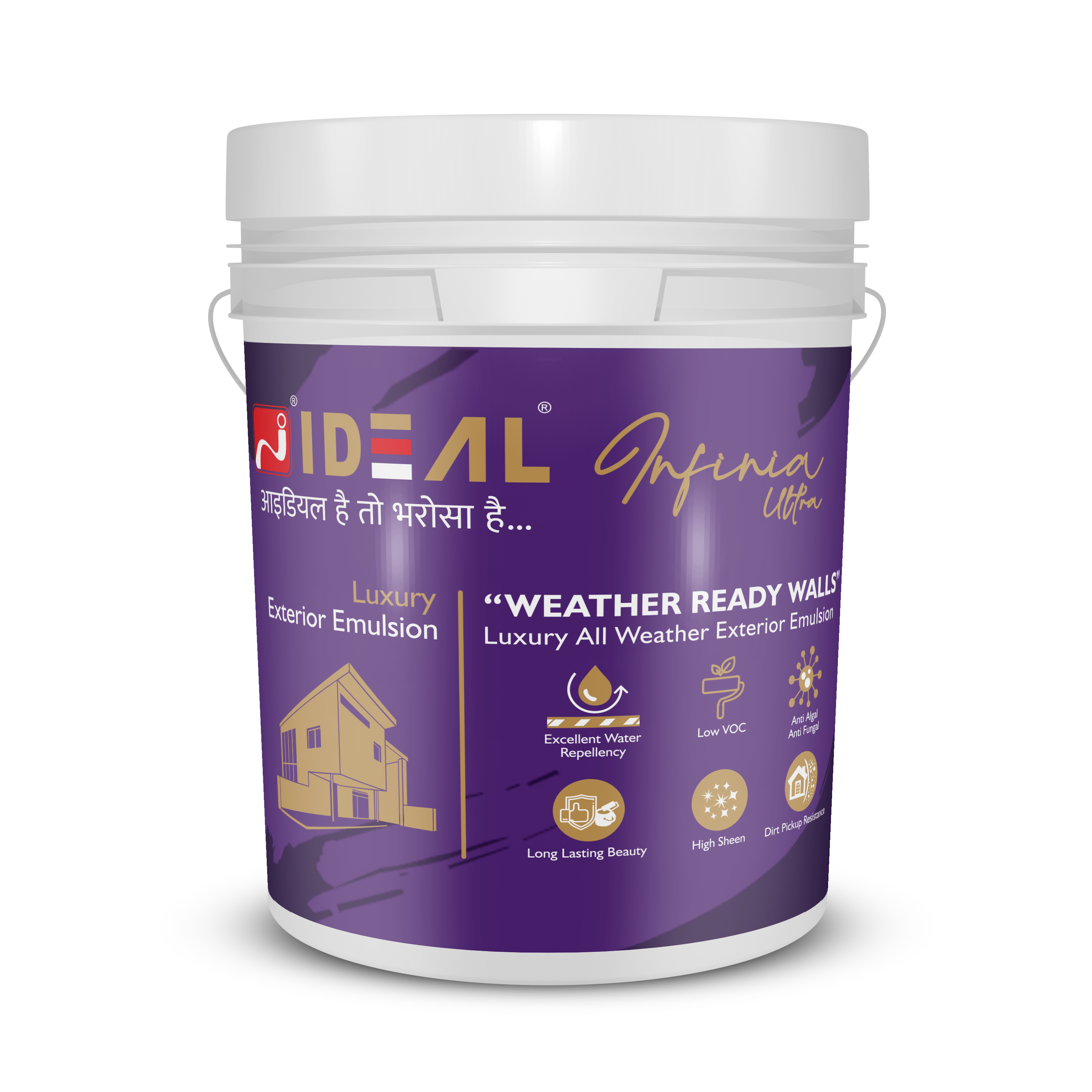 Ideal Infinia Ultra Is a Technologically Advanced Elastomeric Emulsion Which Protects Exterior Walls from Patches of Dampness and Also from Algae and Fungus Formation Caused by Rain. Ideal Infinia Ultra with its unique water- resistant technology, covers hairline cracks and prevents water ingress. Preventing dampness. This super product comes with a truly unique UV cross linking Technology that hardens the top molecular layer of the paint film to give a superior Dust resistance. Latex enrich formula with beautiful sheen finish gives an elegant and Long-Lasting Shine to exterior walls of the building